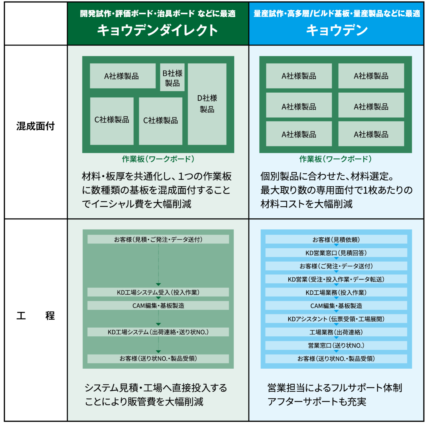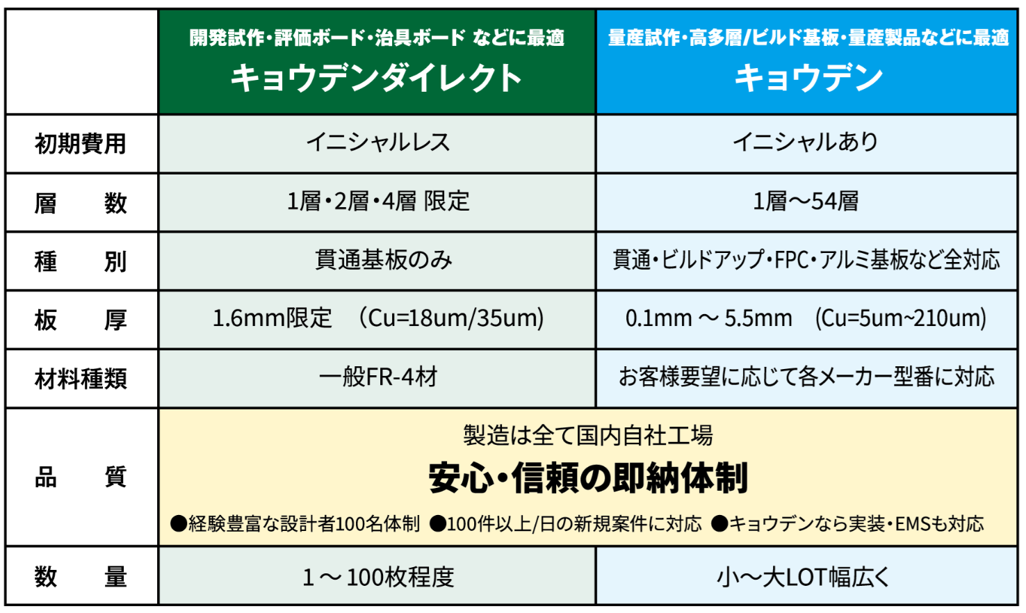 キョウデンダイレクトでは小ロットプリント基板通販向けに、仕様と製造方法を見直しキョウデンの品質はそのままに低価格を実現している。特に開発試作、評価ボード、治具ボード等の試作・評価を短期間で行う場合や特定の小中ロットの製造には最適である。また、キョウデンで製造するため、短納期であっても品質面については万全である。