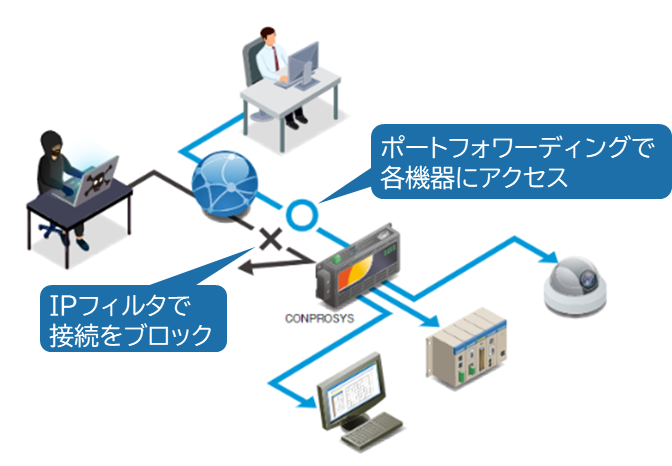 CONPROSYS IoTゲートウェイは、今回新たに BACnet のサーバ機能やクライアント機能、ルータ機能を搭載して、ビル設備のIoT化にも使用できるように進化した。また、DHCPサーバやポートフォワーディングなどのルーティング機能を搭載したことで、機器構成の簡素化やセキュリティの向上に貢献している。