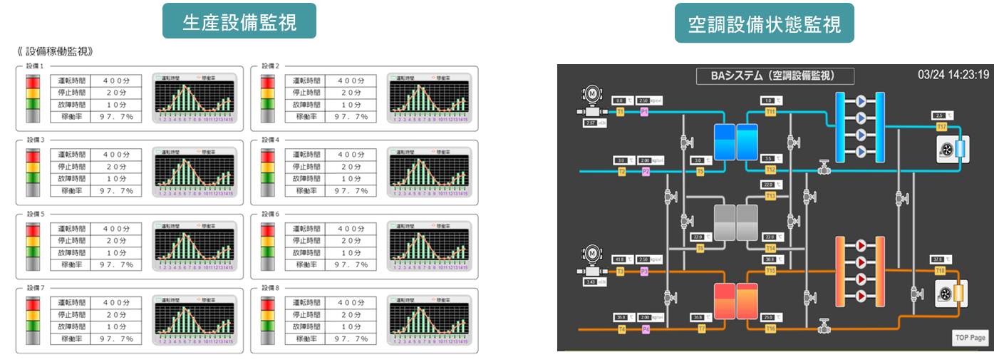 対応のビル設備機器をOPC UA や MTConnect などの通信に変換して工場設備システムと統合することもできる。