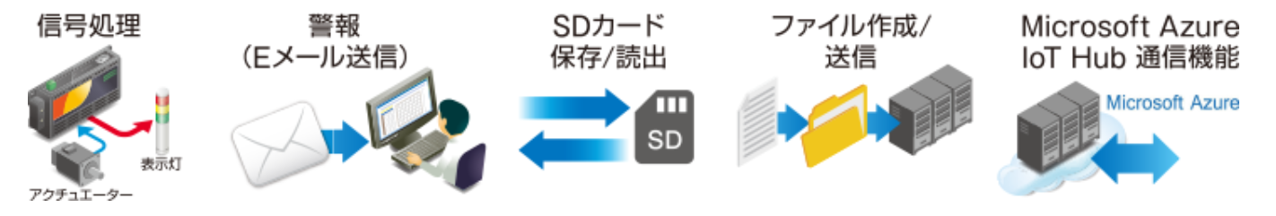 入力データの演算、データ送信、文字列操作、条件分岐、ファイル操作など、50種類の機能アイコンを組み合わせて、ビジュアルにタスク設定が行える。機能アイコンには、Eメール送信、SDカードへのデータ保存/読出、Microsoft