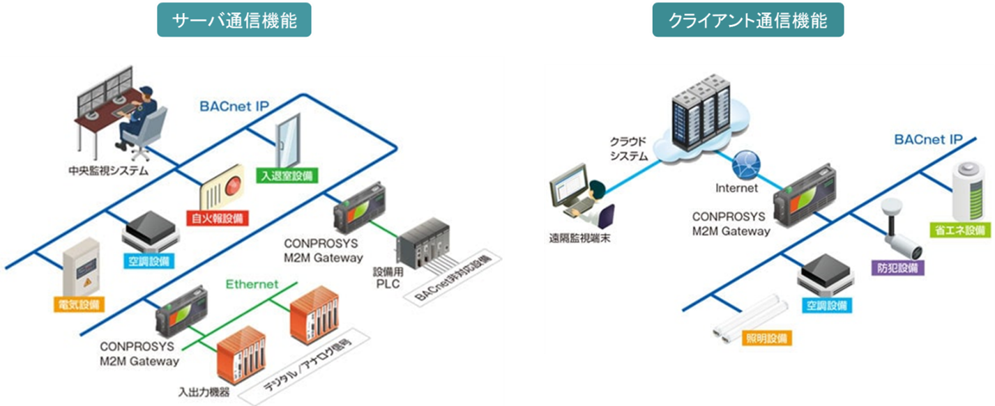 M2M Gatewayは「BACnet IP」プロトコルに対応しており、サーバ通信機能とクライアント通信機能を搭載している。
