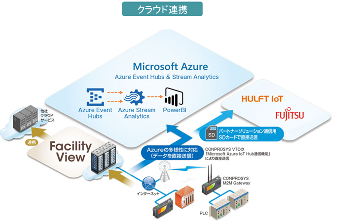 MQTT / HTTPS / TCP などの通信機能により、自社のクラウドサービス 「FacilityView (ファシリティビュー)」 やSCADAソフトウェア CONPROSYS HMI System (CHS) はもちろん、各社のクラウドサービスとの接続性に優れている。